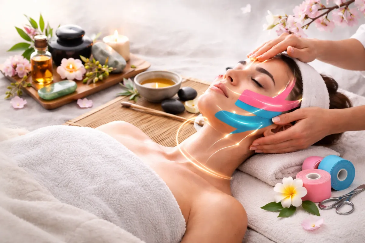 Combining gentle, rhythmic massage techniques on the face, neck, and scalp. Stimulates circulation, enhances skin tone, and promotes a radiant complexion. Facial kinesiotaping complements the massage by supporting facial muscles, reducing tension, and temporarily lifting the skin.